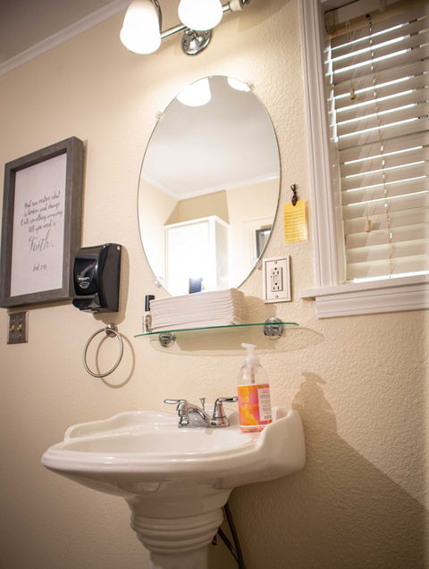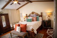 Large King Suite w/modern farmhouse décor featuring antique wardrobe, floor length dressing mirror; inviting entryway; access to porch swing overlooking the fountain; master bathroom